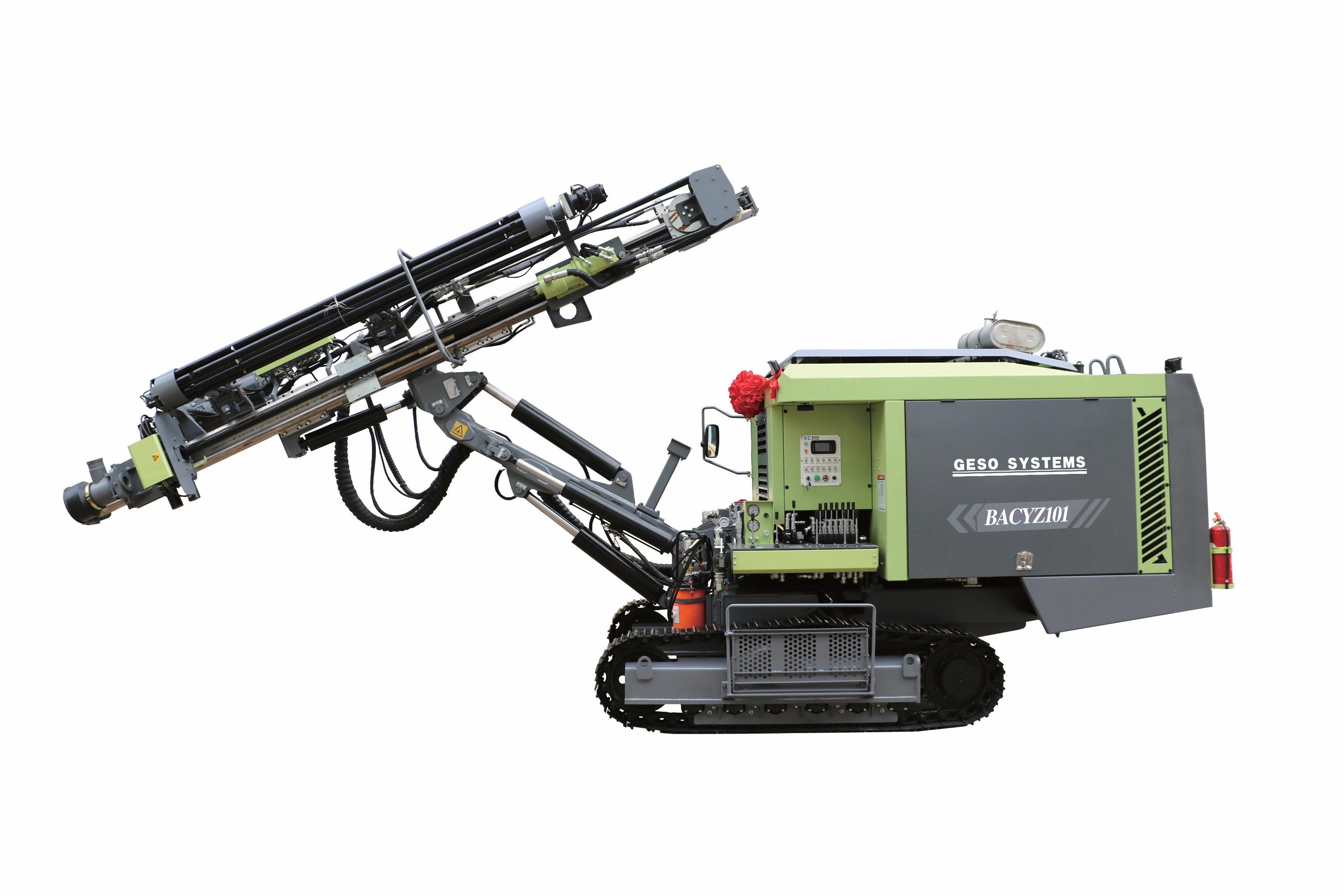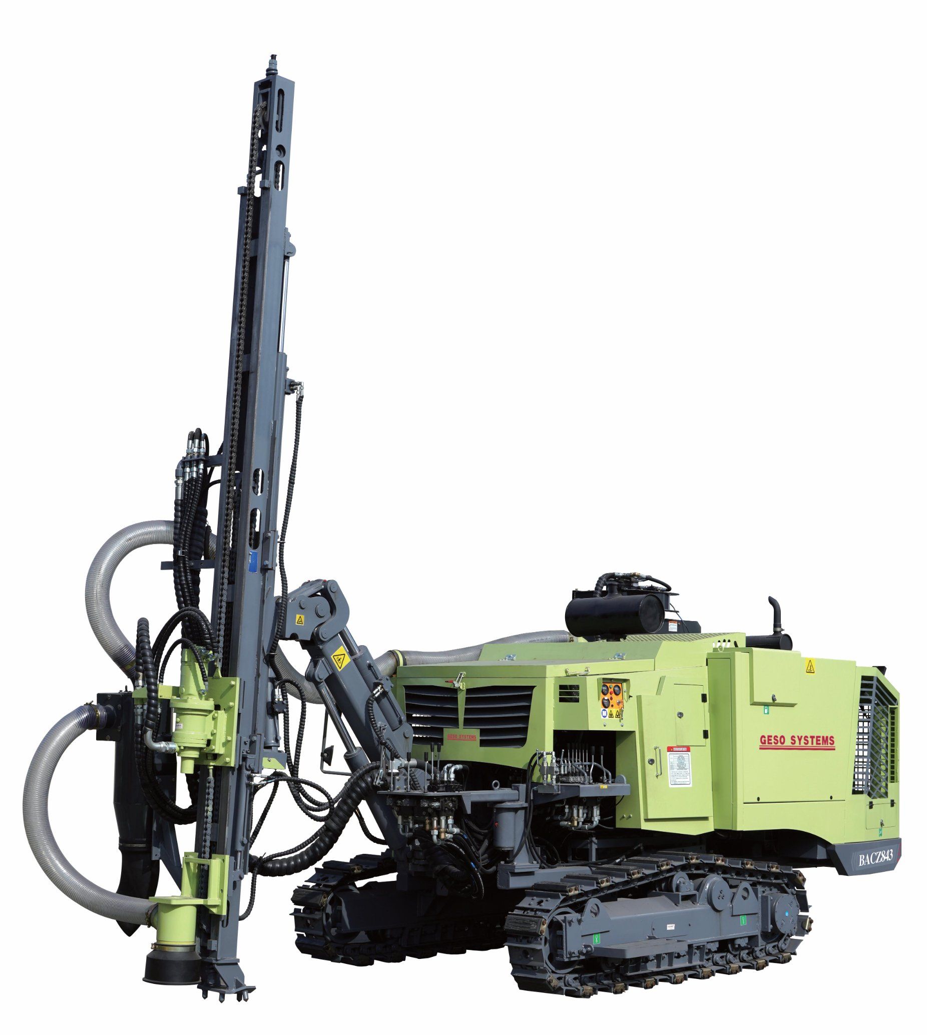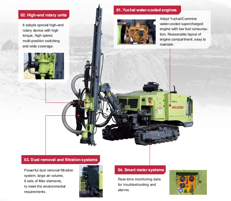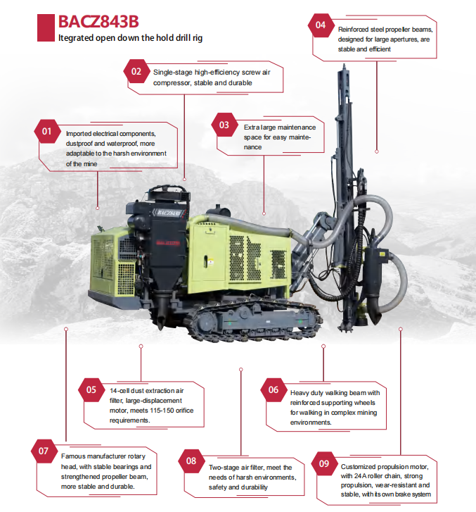 Geso drill compressor BACZ843 Integrated open down the hold drill rig is a drilling equipment which integrates the drilling system and screw air compression system into one. It can drill vertical, inclined and horizontal holes, and is used for drilling blast holes and pre-cracking holes in open pit mines and quarrying projects. Equipped with high efficiency dust collection system.